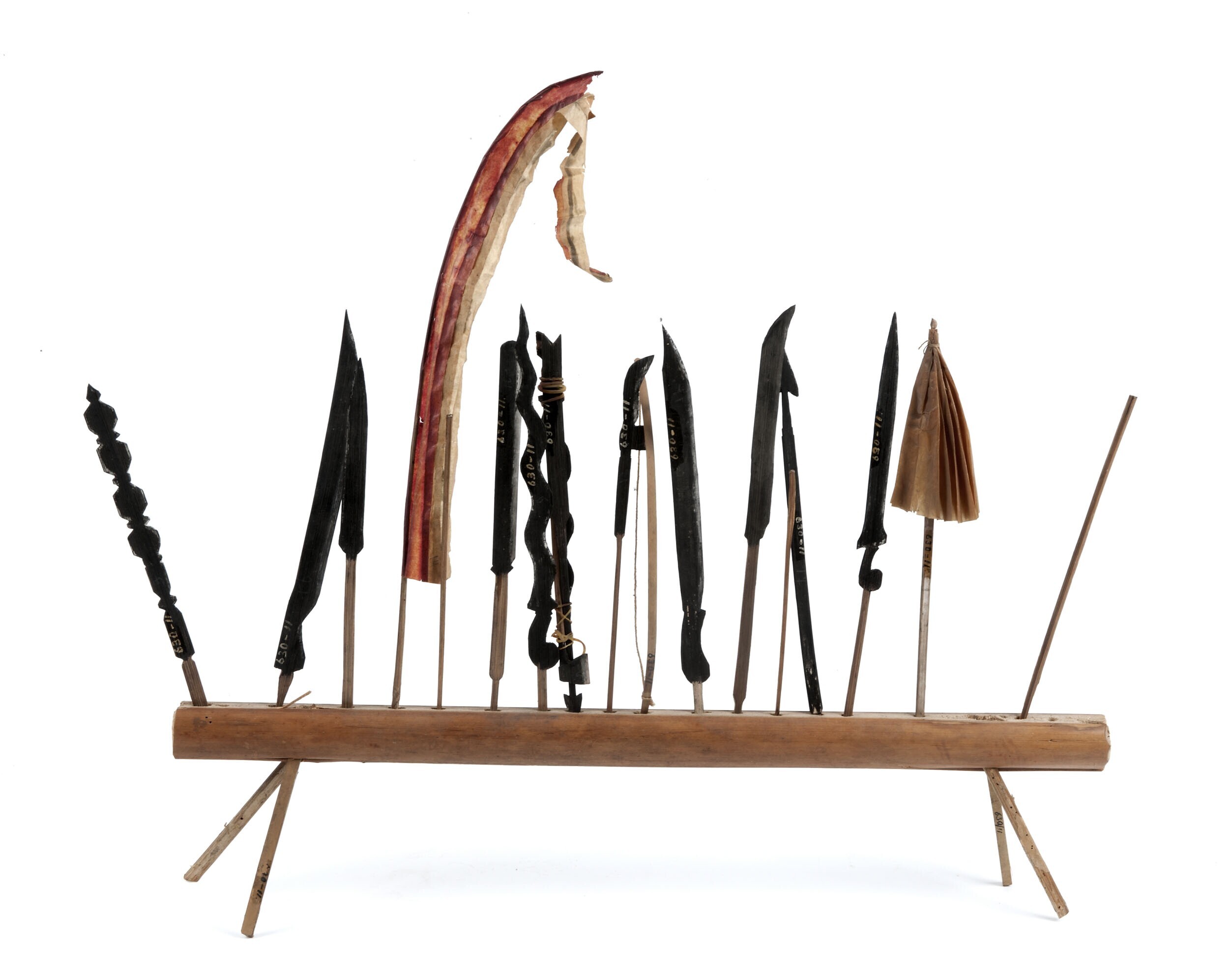 Ingelijste verzameling miniatuurwapens en -werktuigen