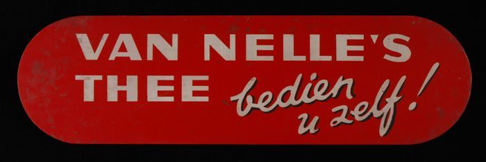 Houten reclamebord Van Nelle met "bedien u zelf!"