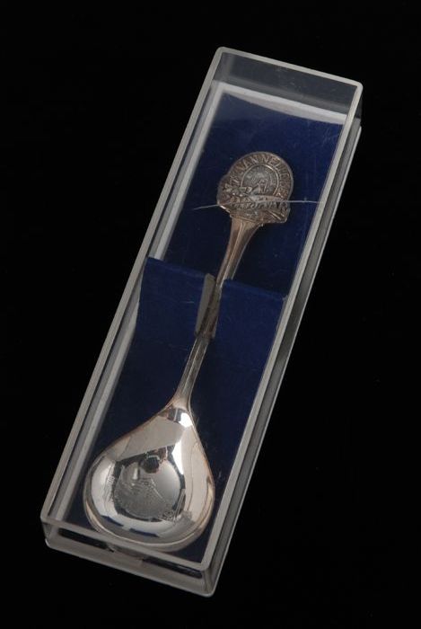 Verzilverde suikerlepel met beeldmerk van Van Nelle,...
