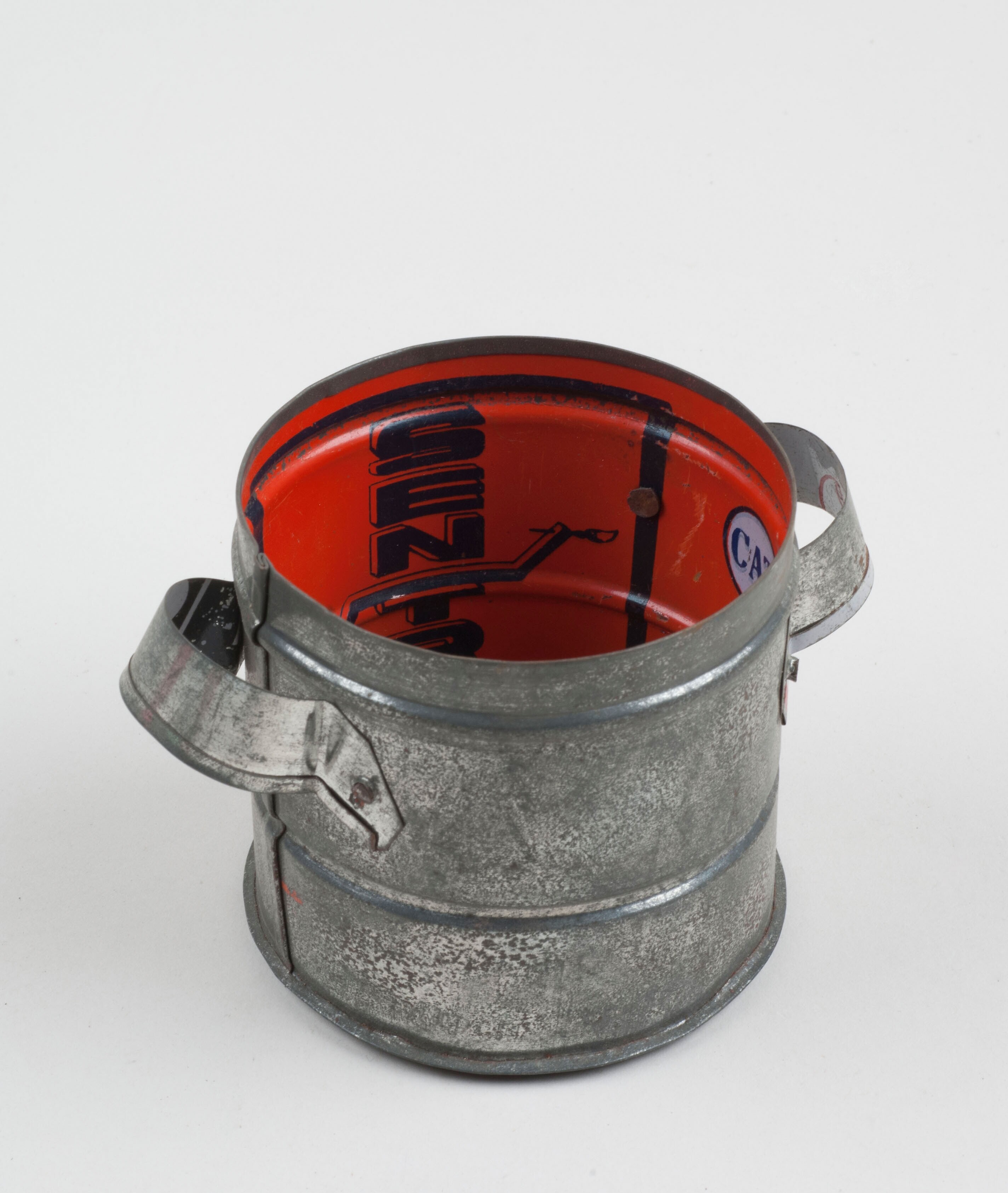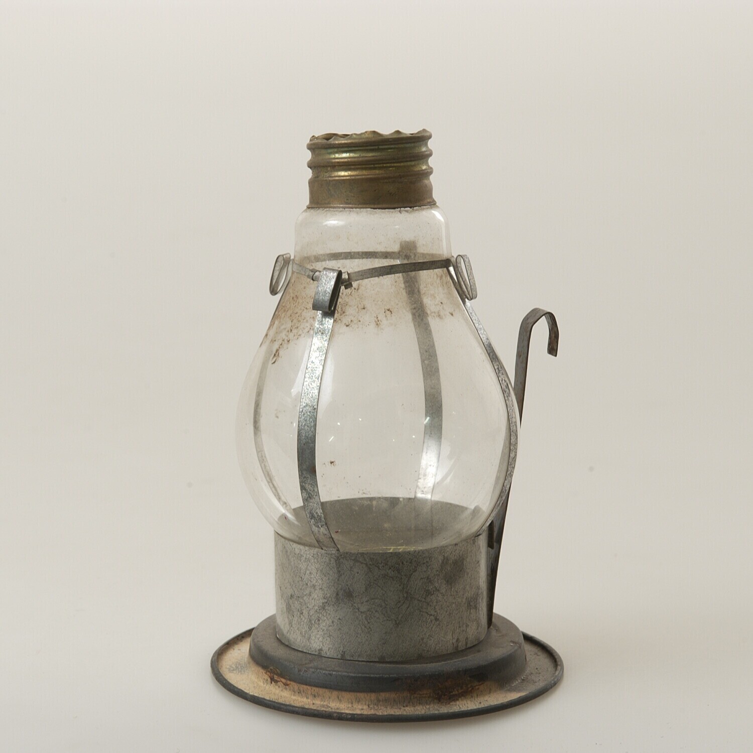 Olielamp van glas en blik, gebruikt als kinderspeelgoed