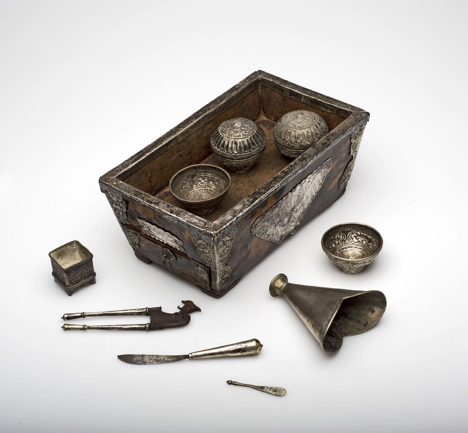 Zilveren bak met deksel behorende bij een sirihstel