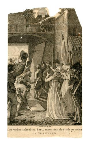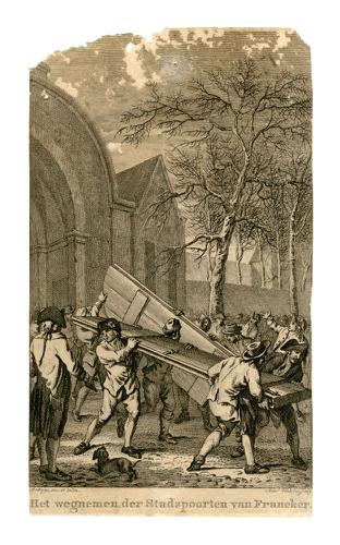Gravure van de stadspoorten van Franeker door Rein V...