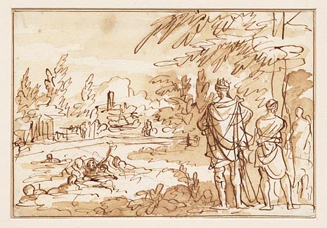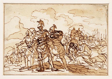 De Amalekiet met Sauls kroon knielt voor David