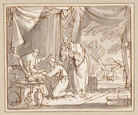De weduwe te Zarfath en haar 2 zoons vullen vaatwerk...