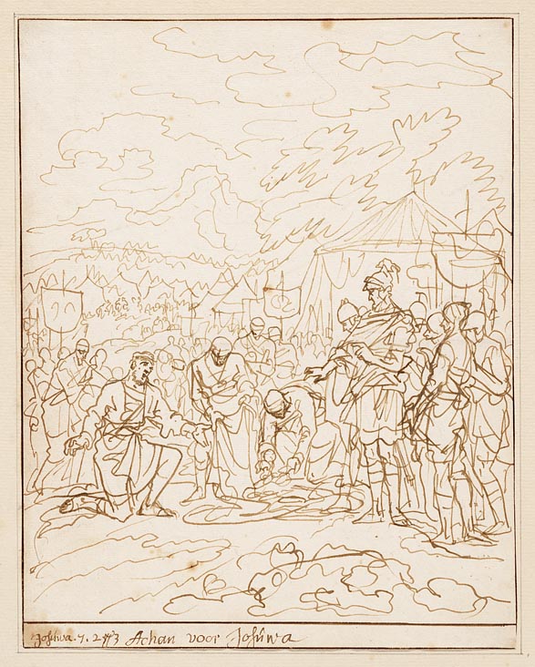 Achan, van diefstal overtuigd, knielt voor Jozua