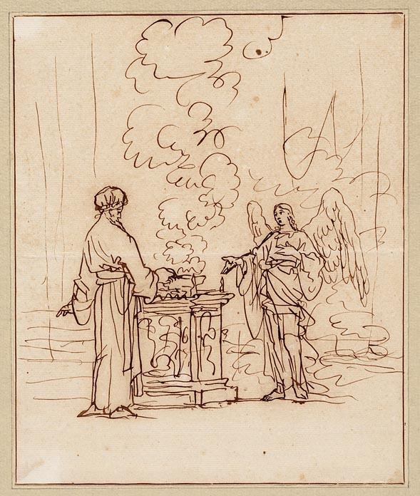 Manoach en zijn vrouw knielen bij het altaar waarbov...