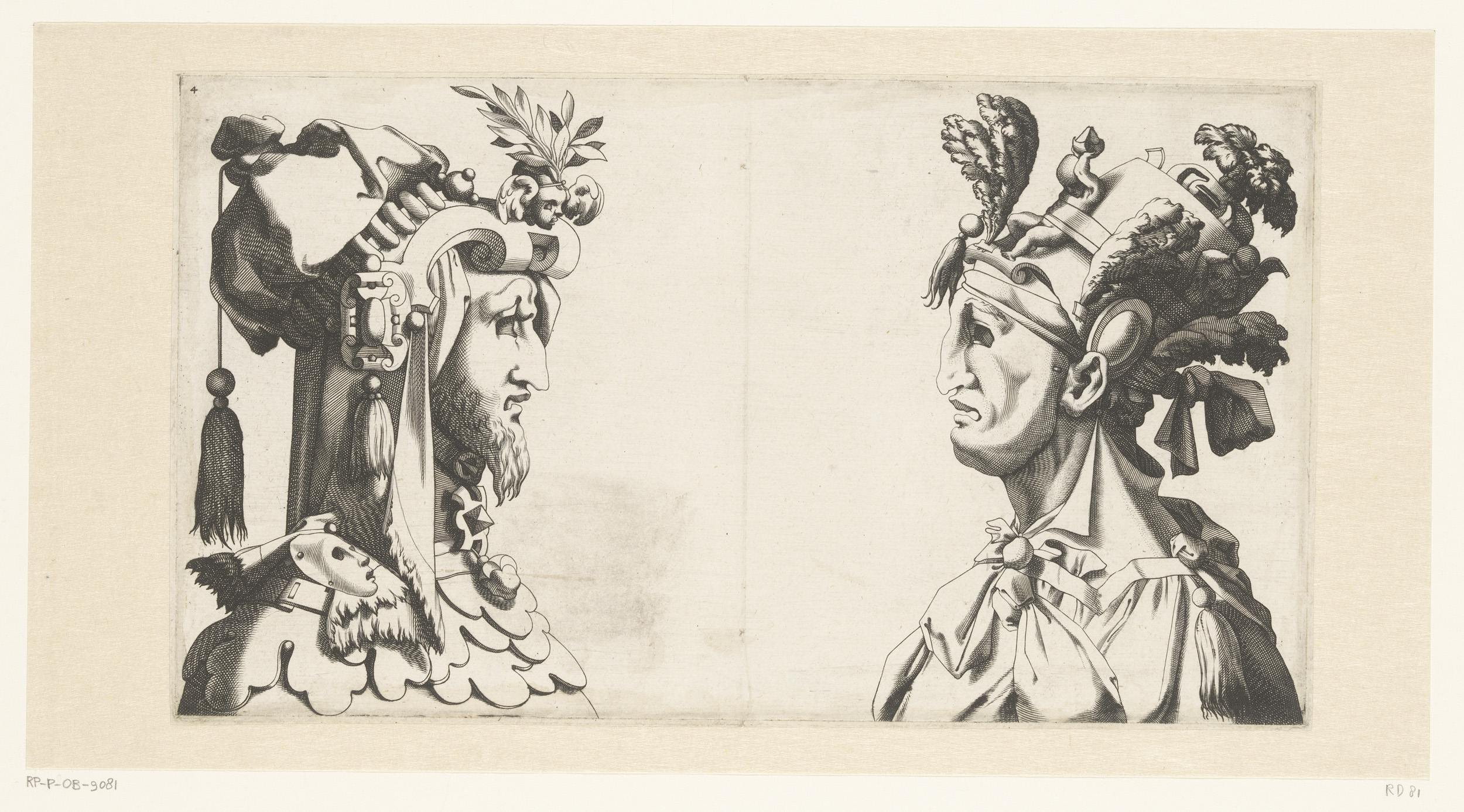 Twee mannenbustes met maskers en fantasiehoofdbedekking