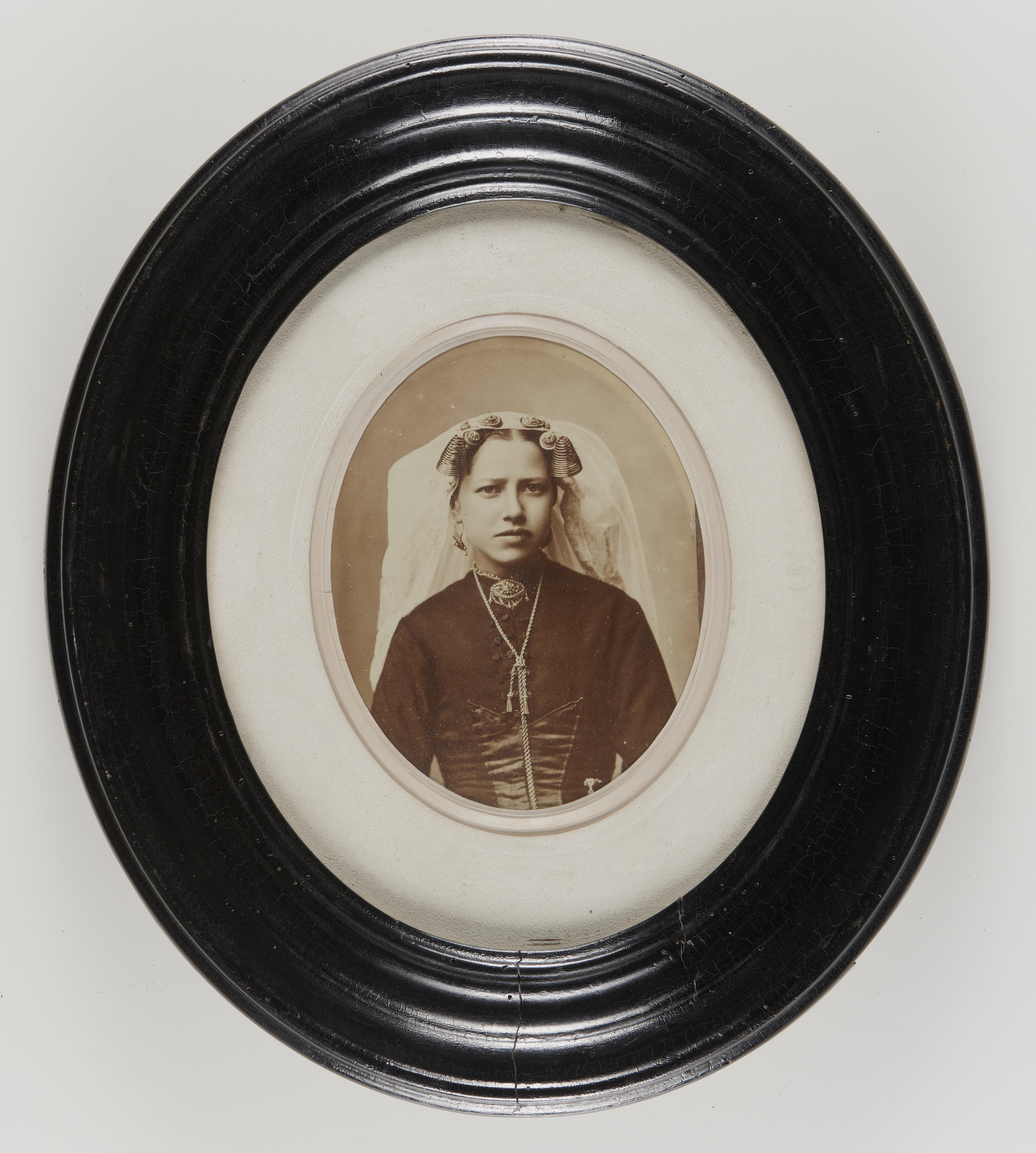 Ingelijste foto van vrouw in streekdracht, 1885-1896