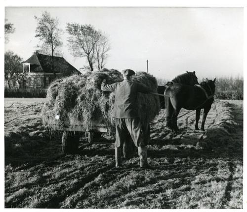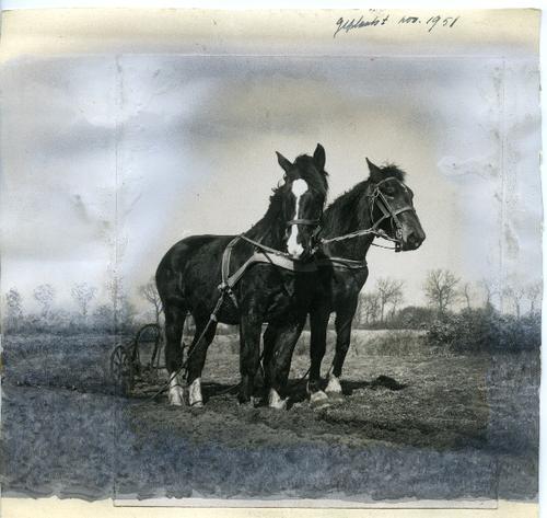 Foto in zwart-wit van twee paarden voor een ploeg, 1951