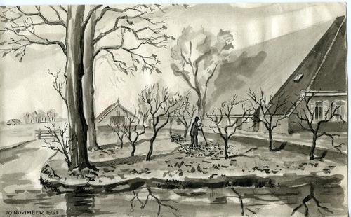 Tekening in zwart-wit van een boerderij met boomgaar...