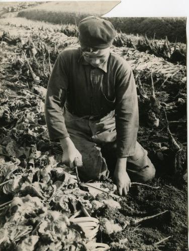 Foto in zwart-wit van een jonge man die bieten kopt ...