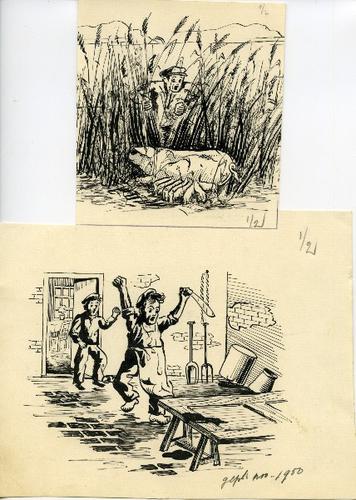 Tekening in zwart-wit van het weggelopen slachtvarke...
