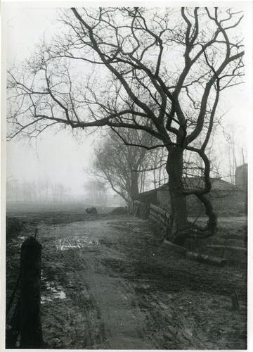 Foto in zwart-wit van een zandpad naar een boerenerf...