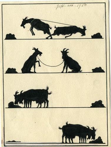 Tekening in zwart-wit van twee geiten aan één touw