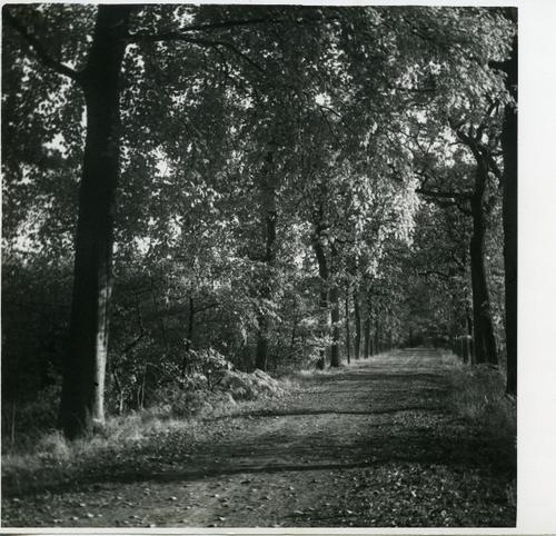 Foto in zwart-wit van een zandpad met hoge bomen en ...