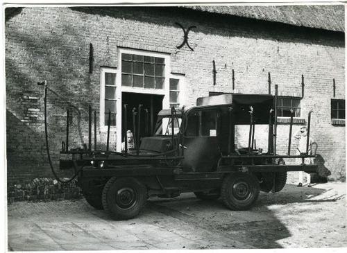 Foto in zwart-wit van een Jeep voor het zg jeepmelke...