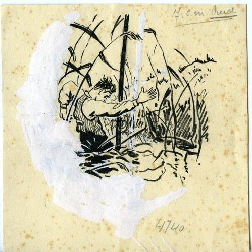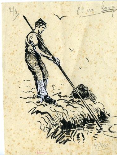 Tekening in zwart-wit van een man die een sloot hekkelt