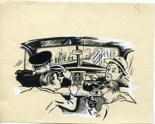 Tekening in zwart-wit van vier personen in een taxi