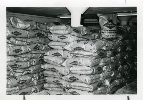 Foto in zwart-wit van zakken kunstmelkpoeder van Spr...