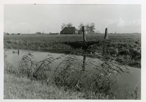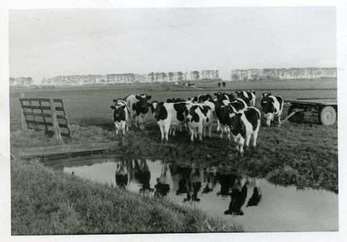 Foto in zwart-wit van jongvee naast een sloot, 1962