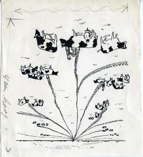 Tekening in zwart-wit van een optocht van koeien en ...