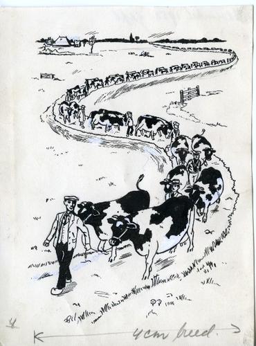 Tekening in zwart-wit van rijen melkbussen naar groe...