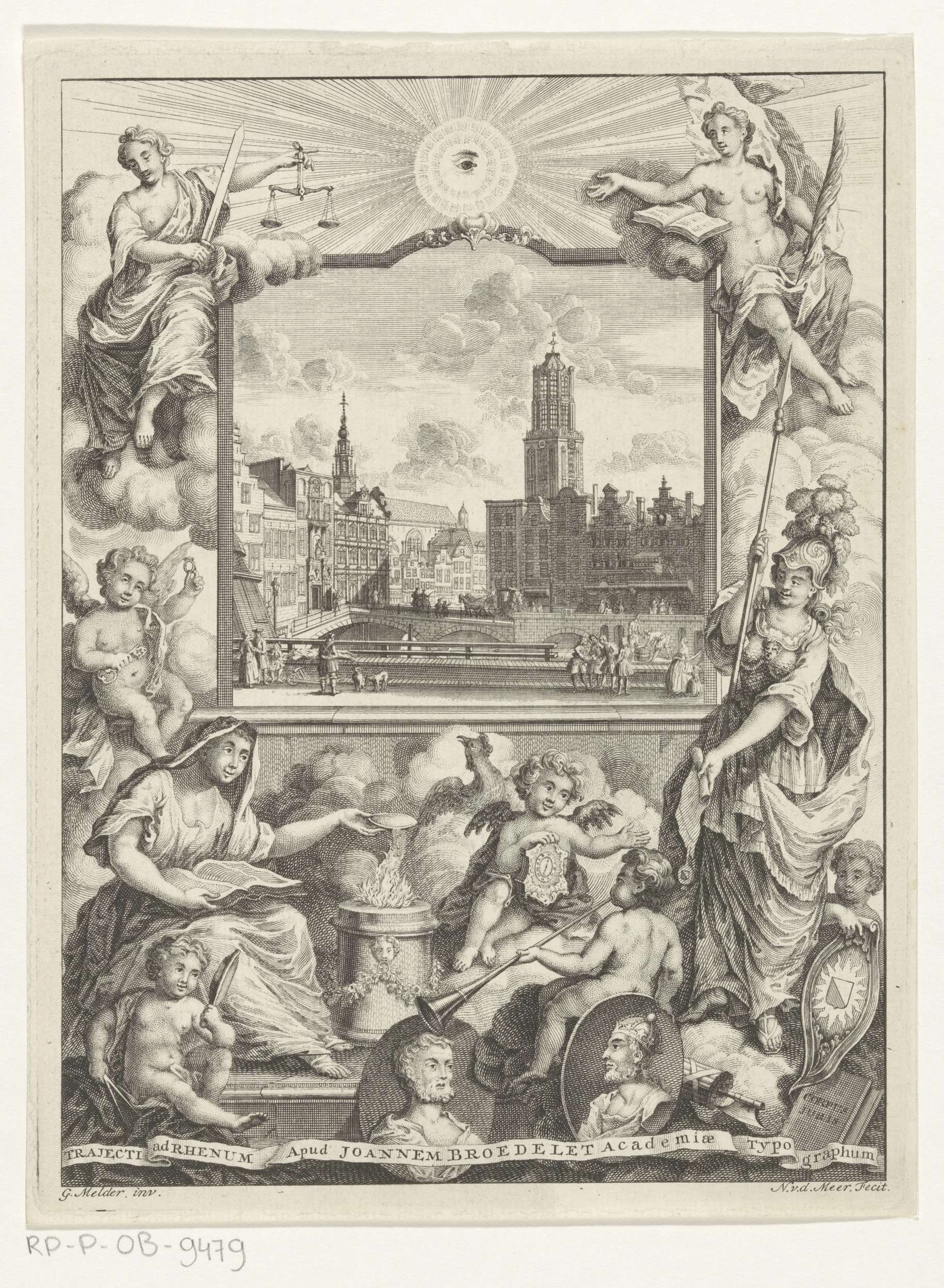 Stadsgezicht met Domkerk te Utrecht en allegorie met...