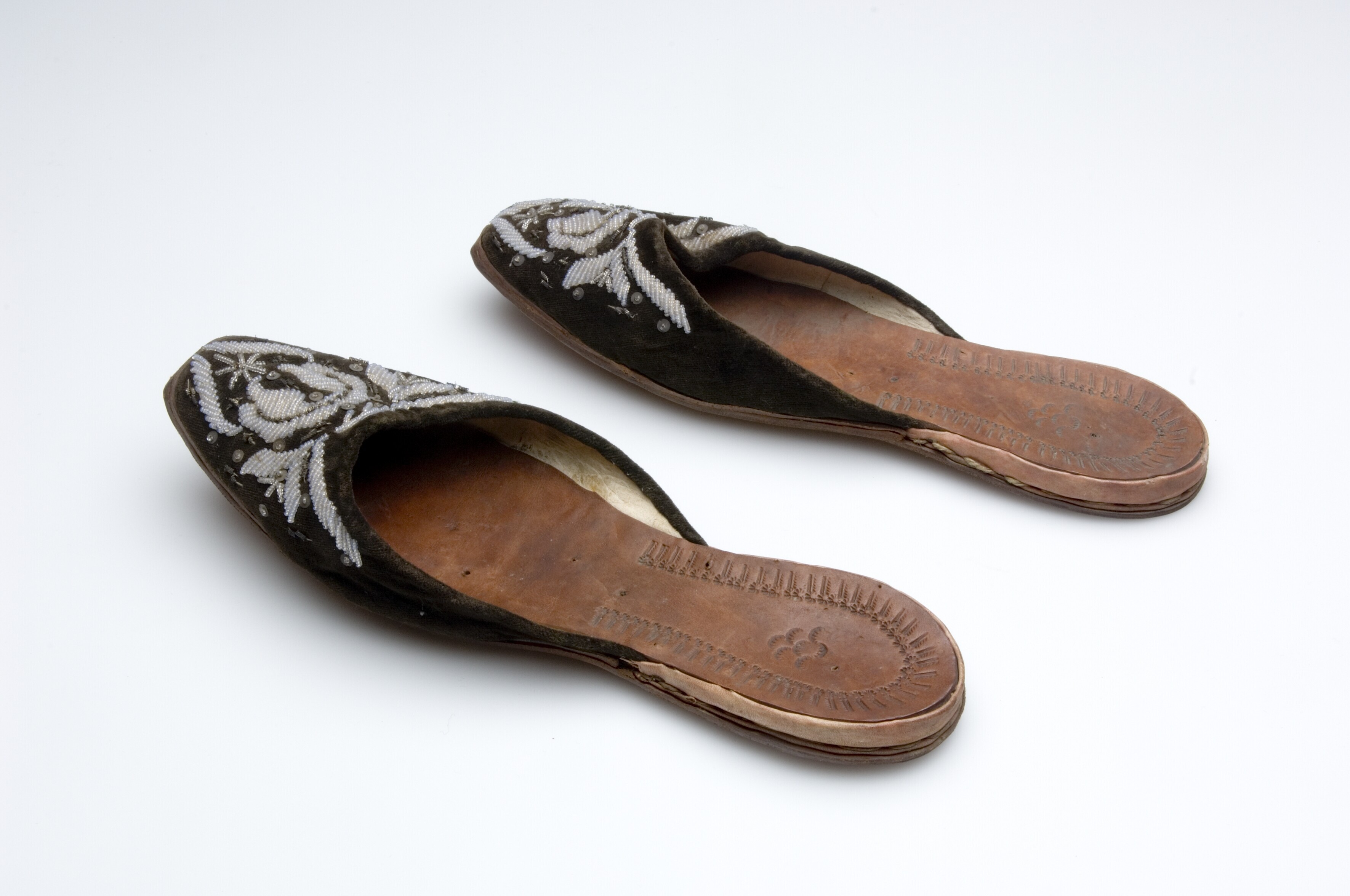 Een paar muiltjes van zwart fluweel met witte kraalw...