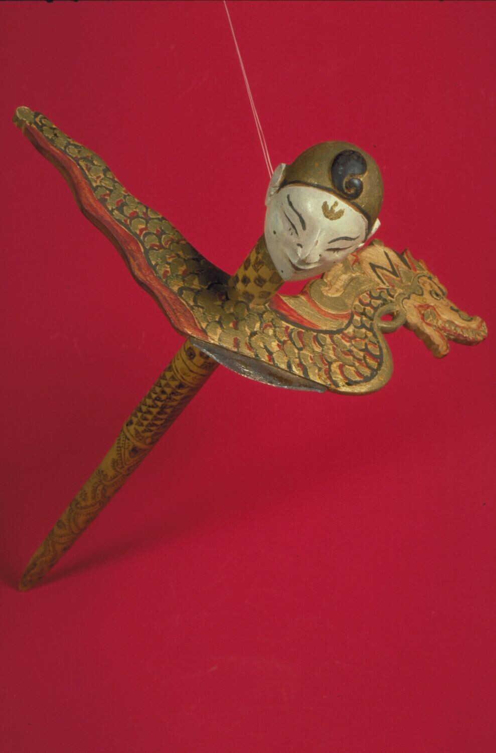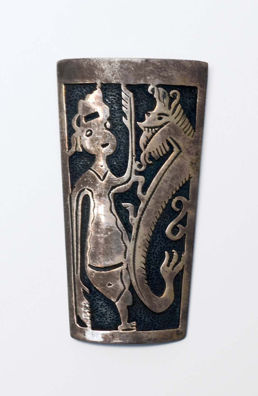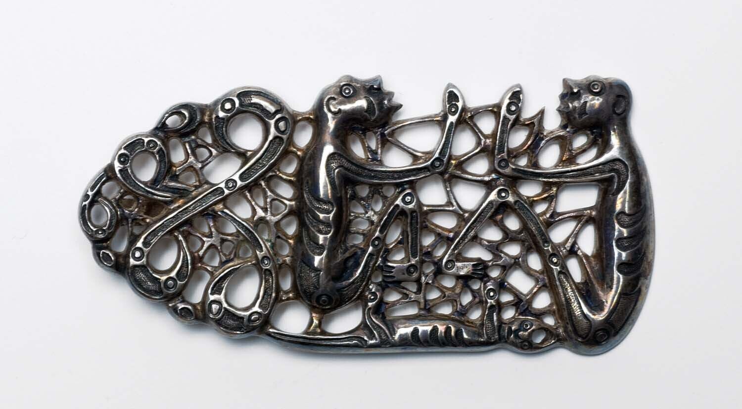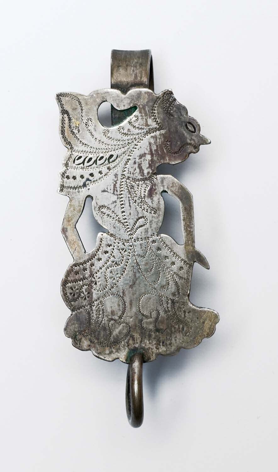 Metalen haak met een zilveren wayangfiguur, voor het...