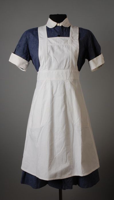 Jurk van blauw-wit katoen met wit schort, witte kraa...