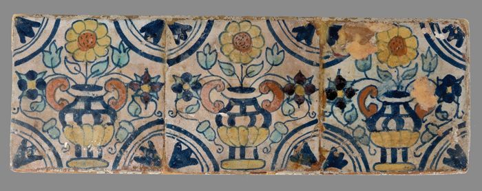 Bloemtegel, tegelveld van drie stuks, één hoog en dr...