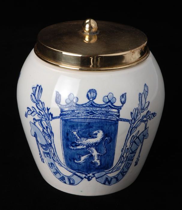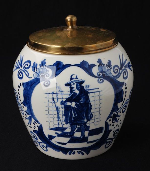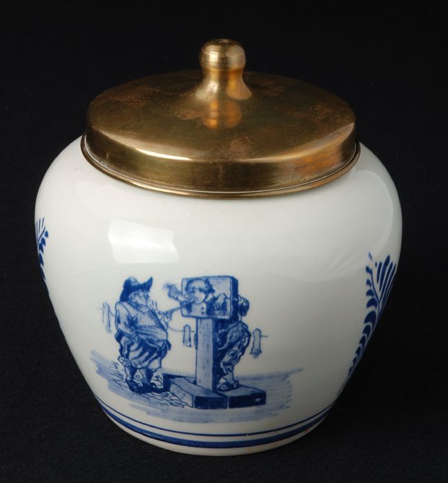 Delfts blauwe voorraadpot voor tabak met koperen dek...