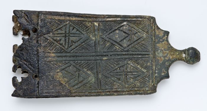 Koperen riemtong, leerbeslag met gegraveerde ruiten ...
