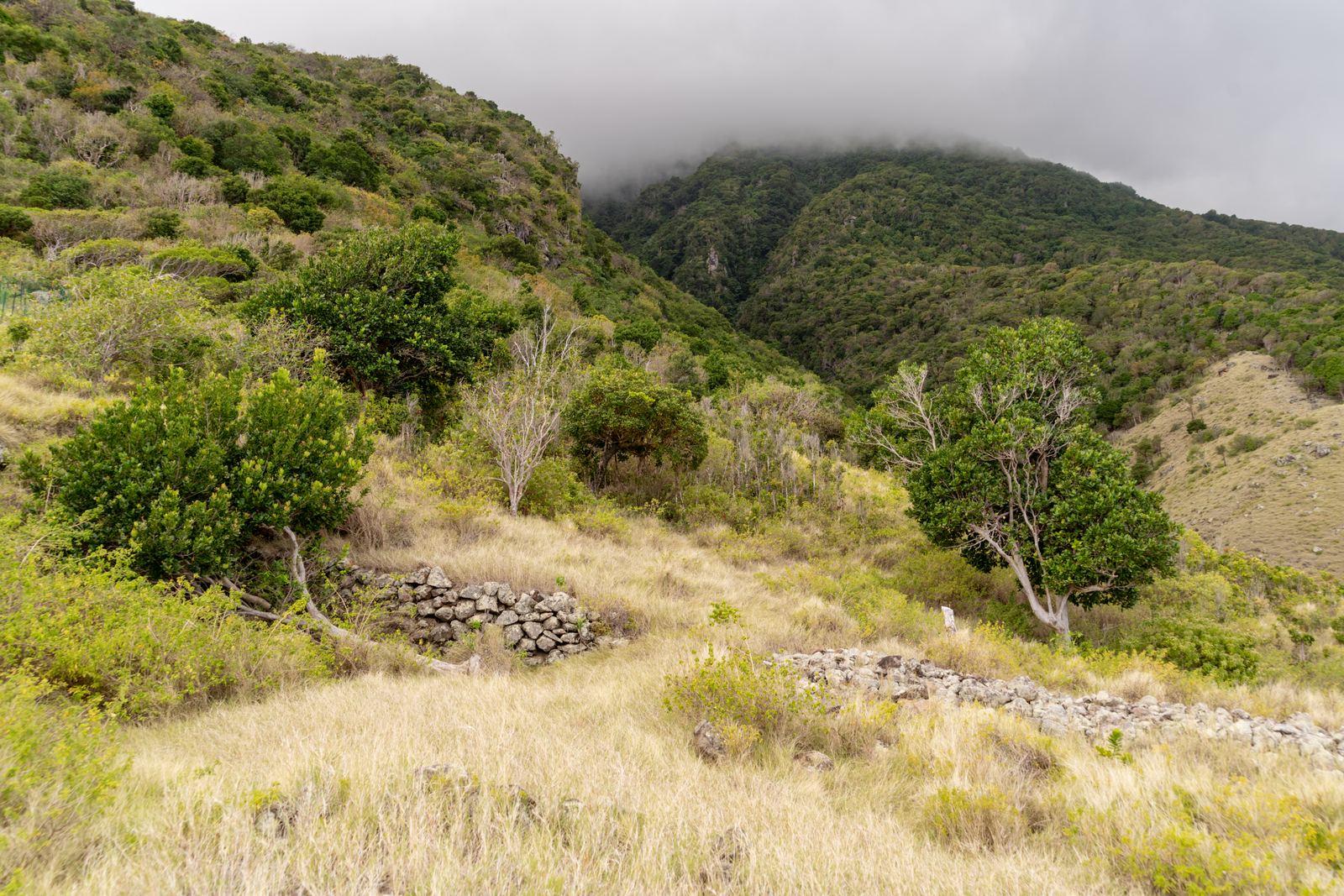 Droog struikgewas, grasland en restanten van muren n...