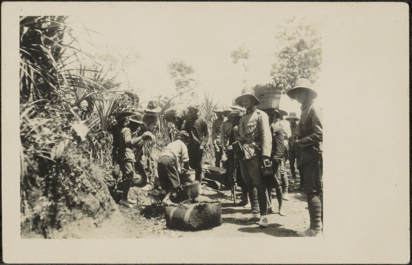 Groepsportret met twee mannen in uniform te Ngamplang