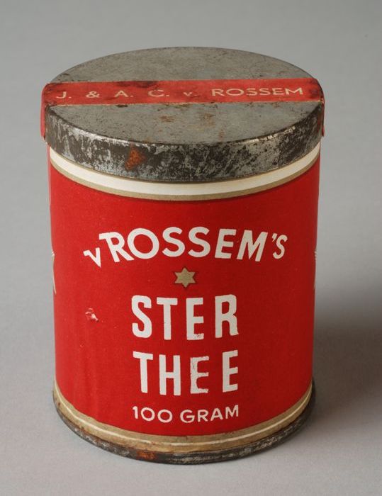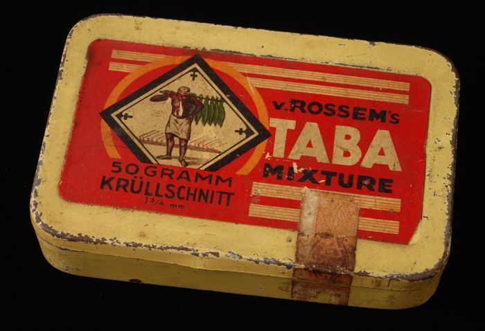 Geel met rood tabaksblik van Van Rossem, productnaam...