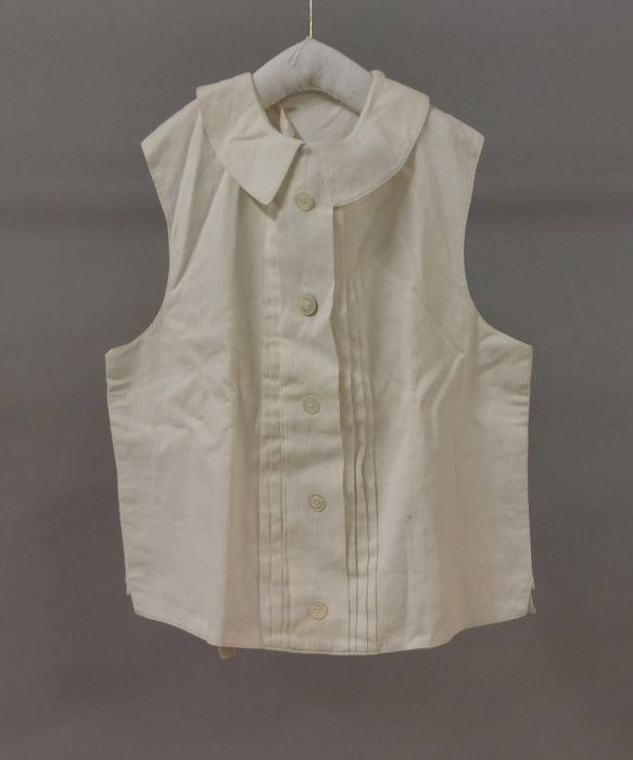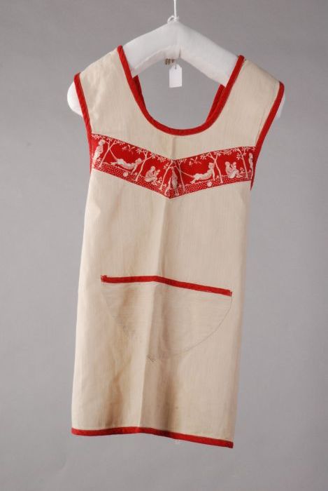 Ecru mouwloos kinderschort met rood band afgebiesd