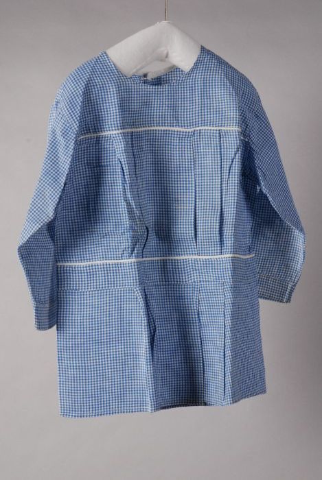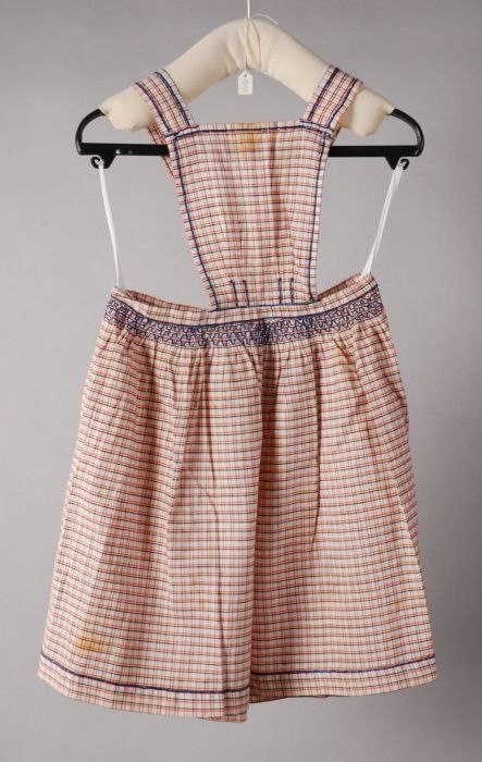 Wit met blauw geruite kinderschort of kinderjurk met...