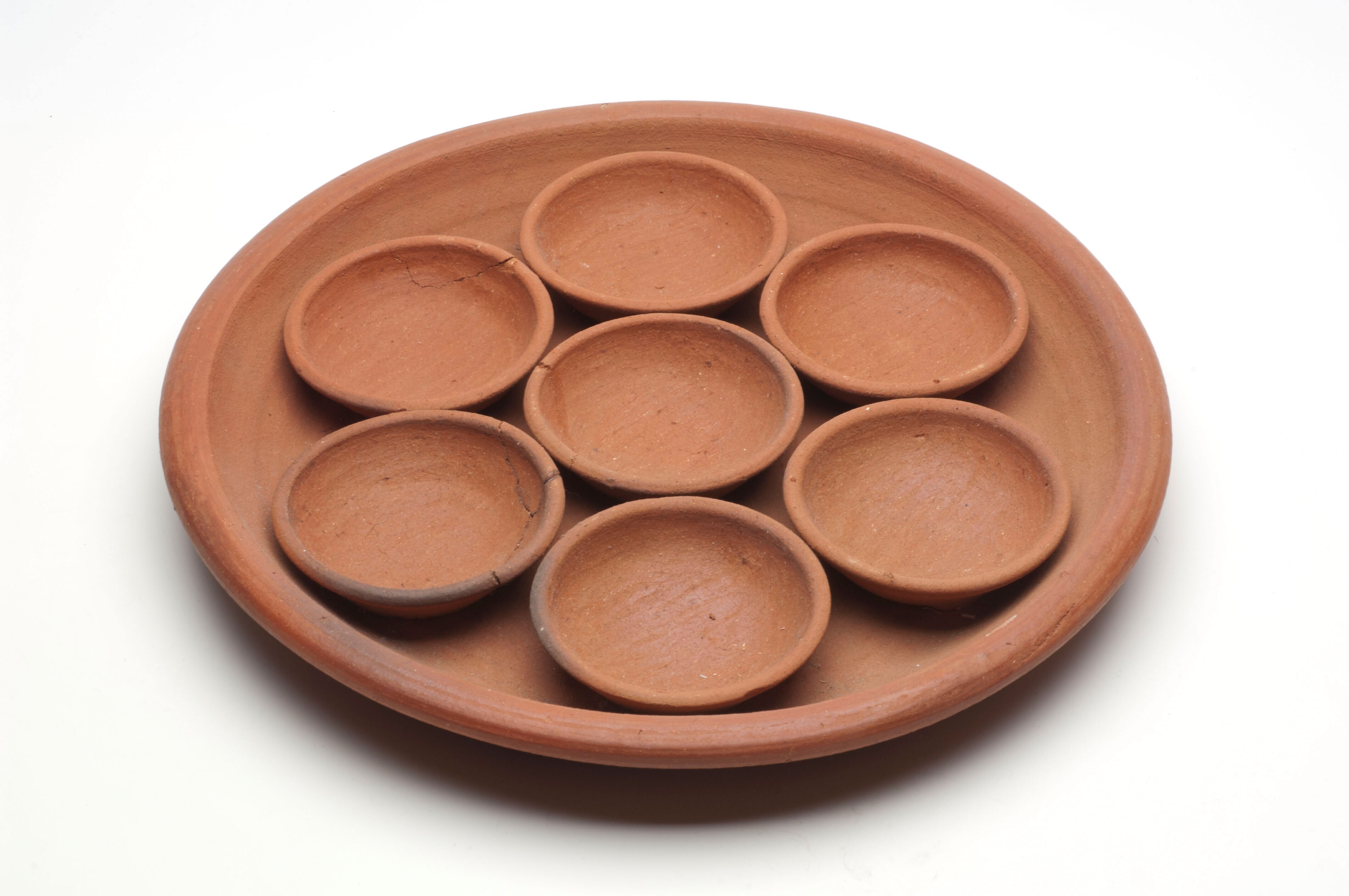 Aardewerken koekjesschaal met zeven kleine schaaltje...