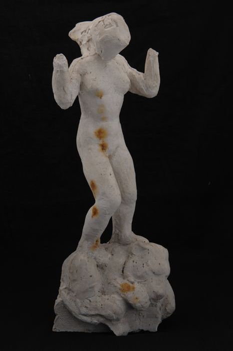 Ontwerp in gips voor natuurstenen beeld, voorover ge...