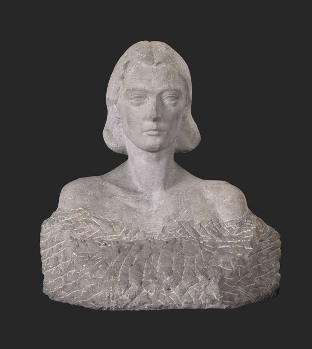 Ontwerp in gips voor natuurstenen beeld, vrouw met k...
