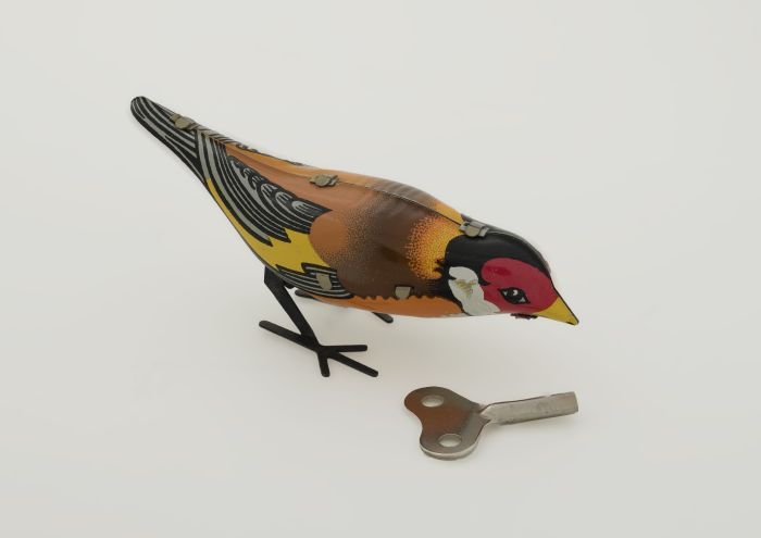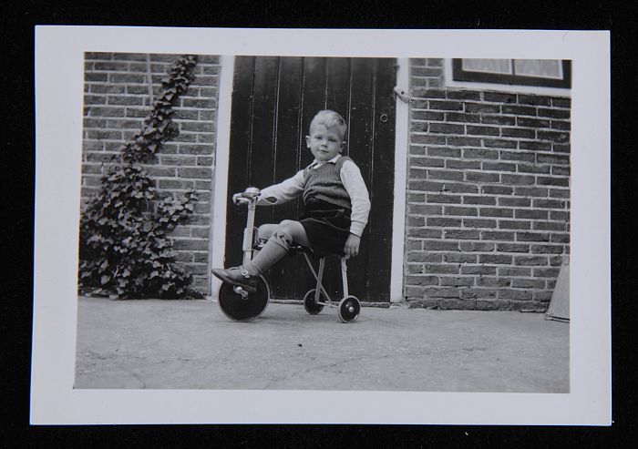 Kleine zwart-witfoto van een jongetje op een driewie...