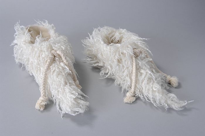 Pantoffels van wit langharig kroezig kunstbont, stri...