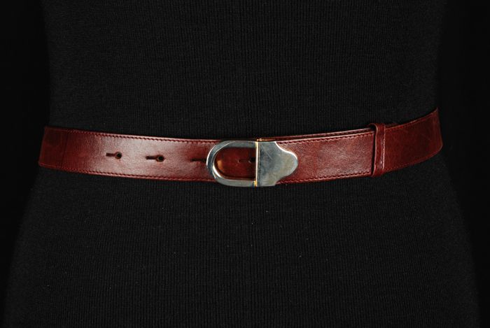 Dameshoed van bruin haarvilt, zwart leren bandje met...