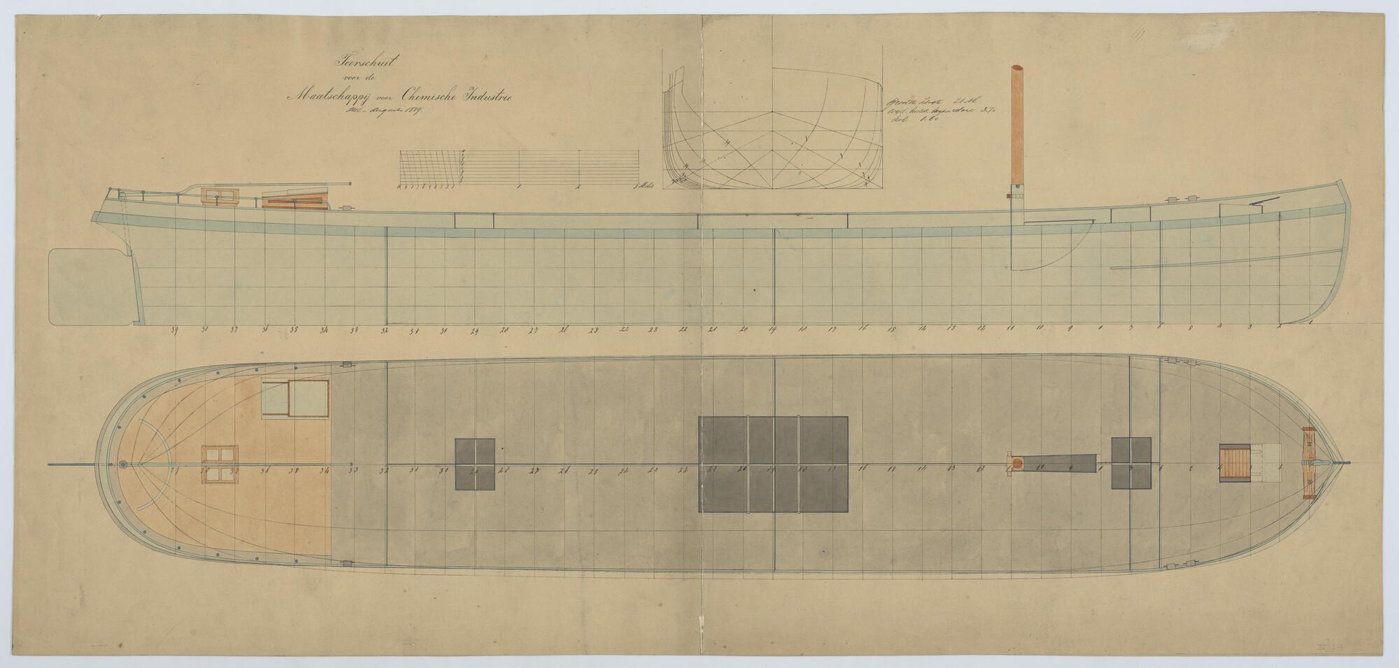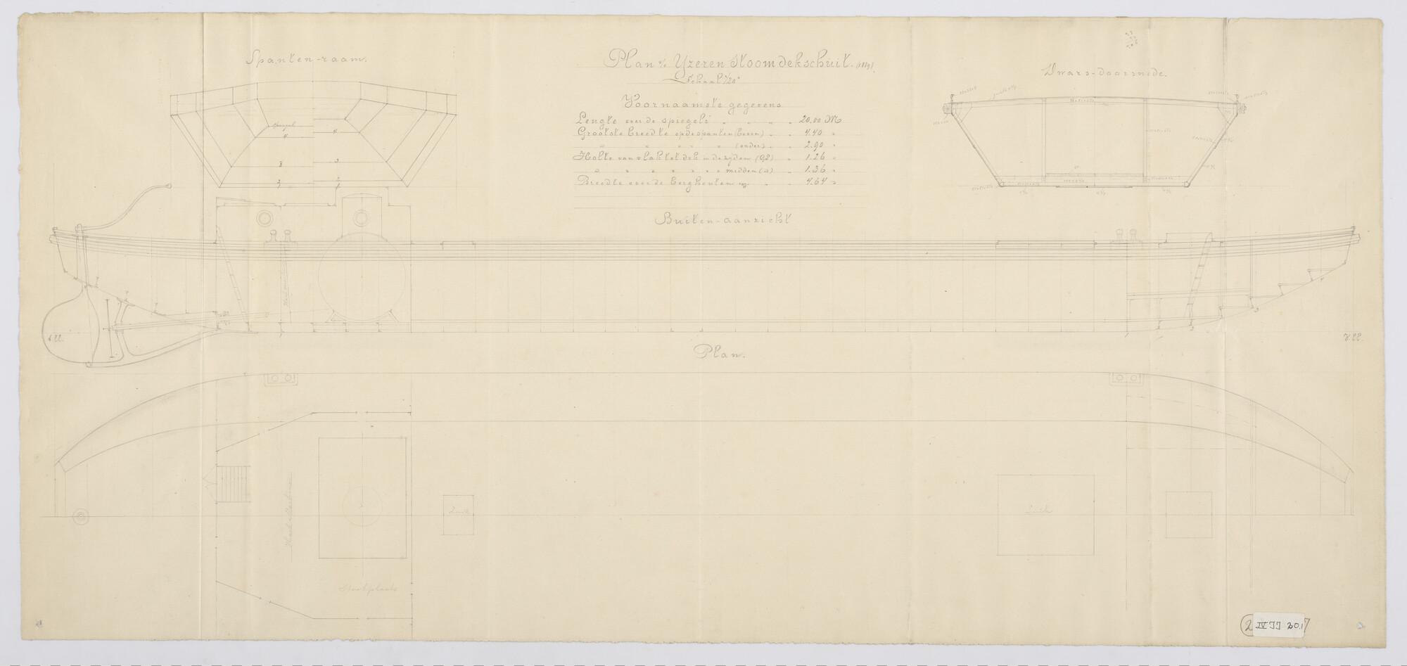 Plan van een ijzeren stoomdekschuit. Boven- en zijaa...