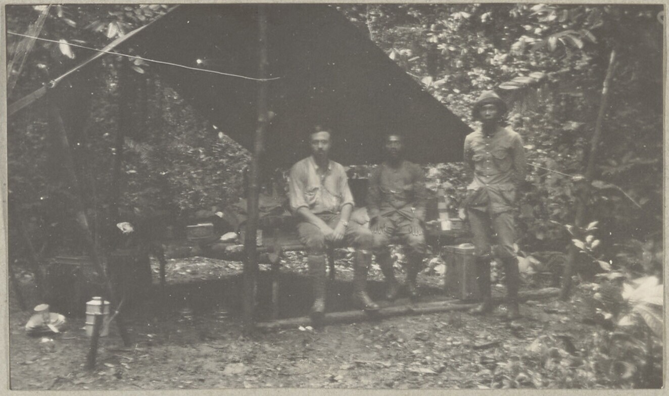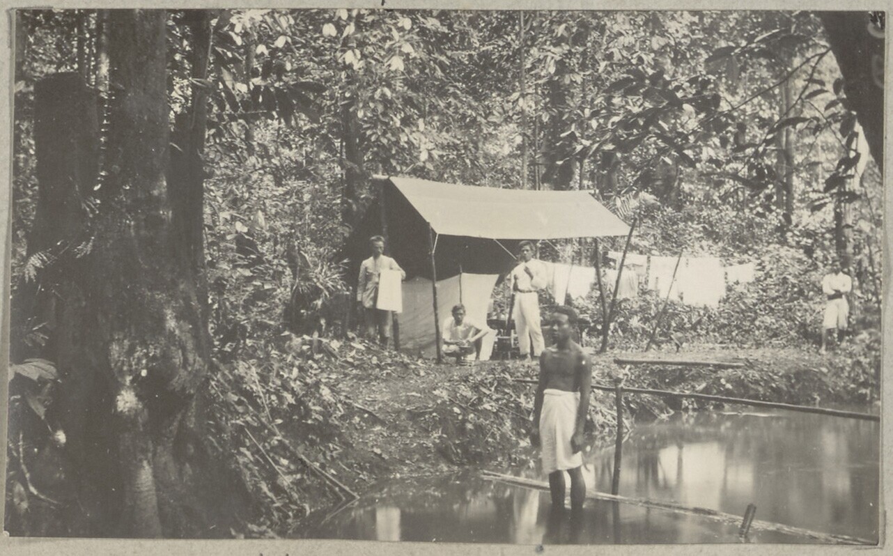 Bivak in een bos met ijzerhoutbomen, omgeving Moeara...