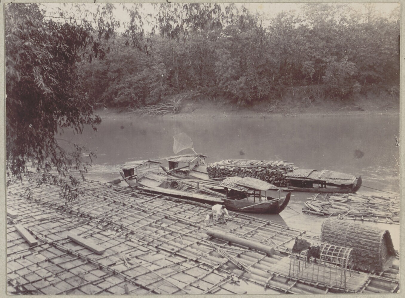 Houtvlotten en prauwen op de rivier Bengawan Solo bi...