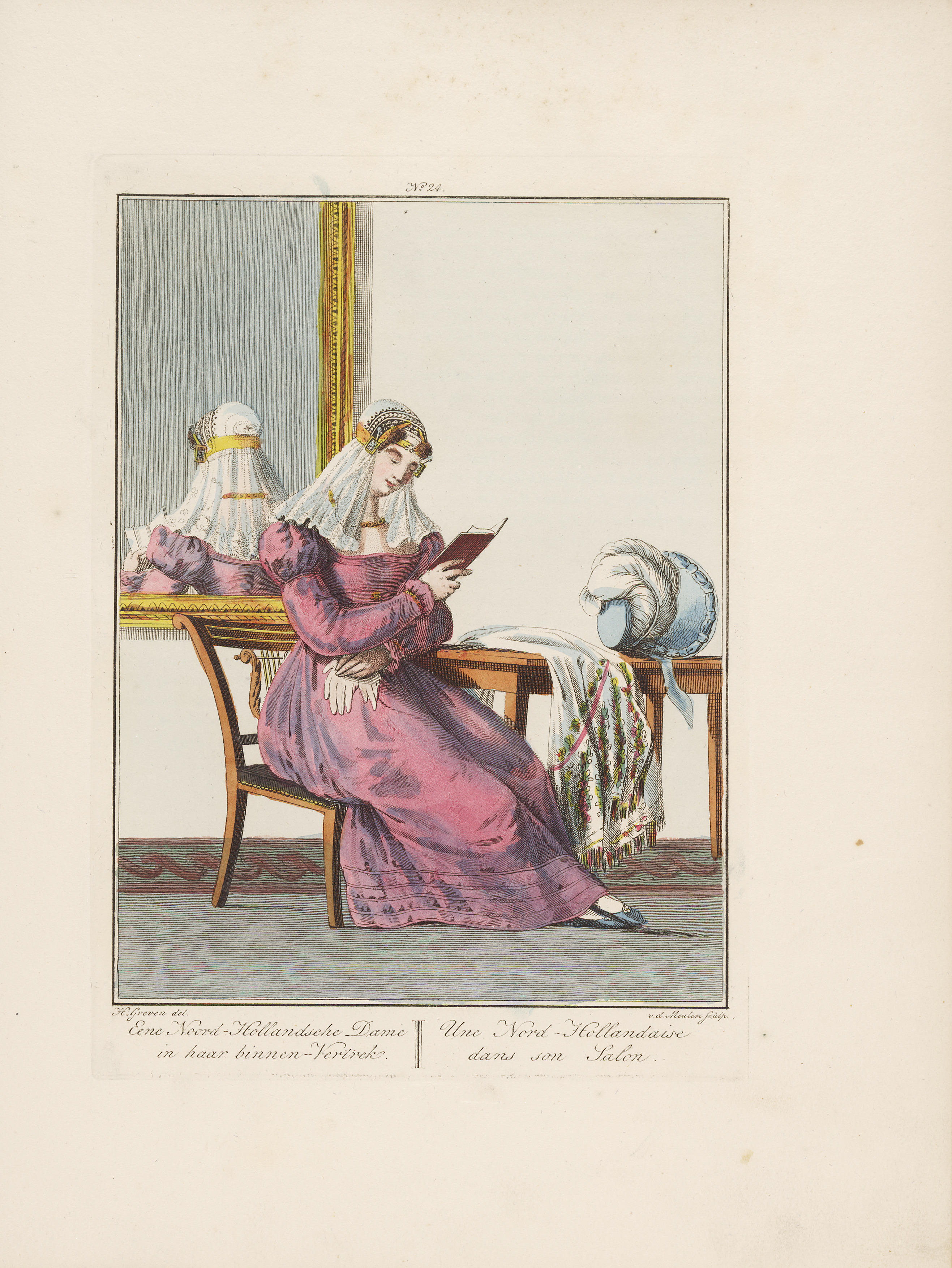 Lezende vrouw in Noord-Hollandse dracht (gravure)