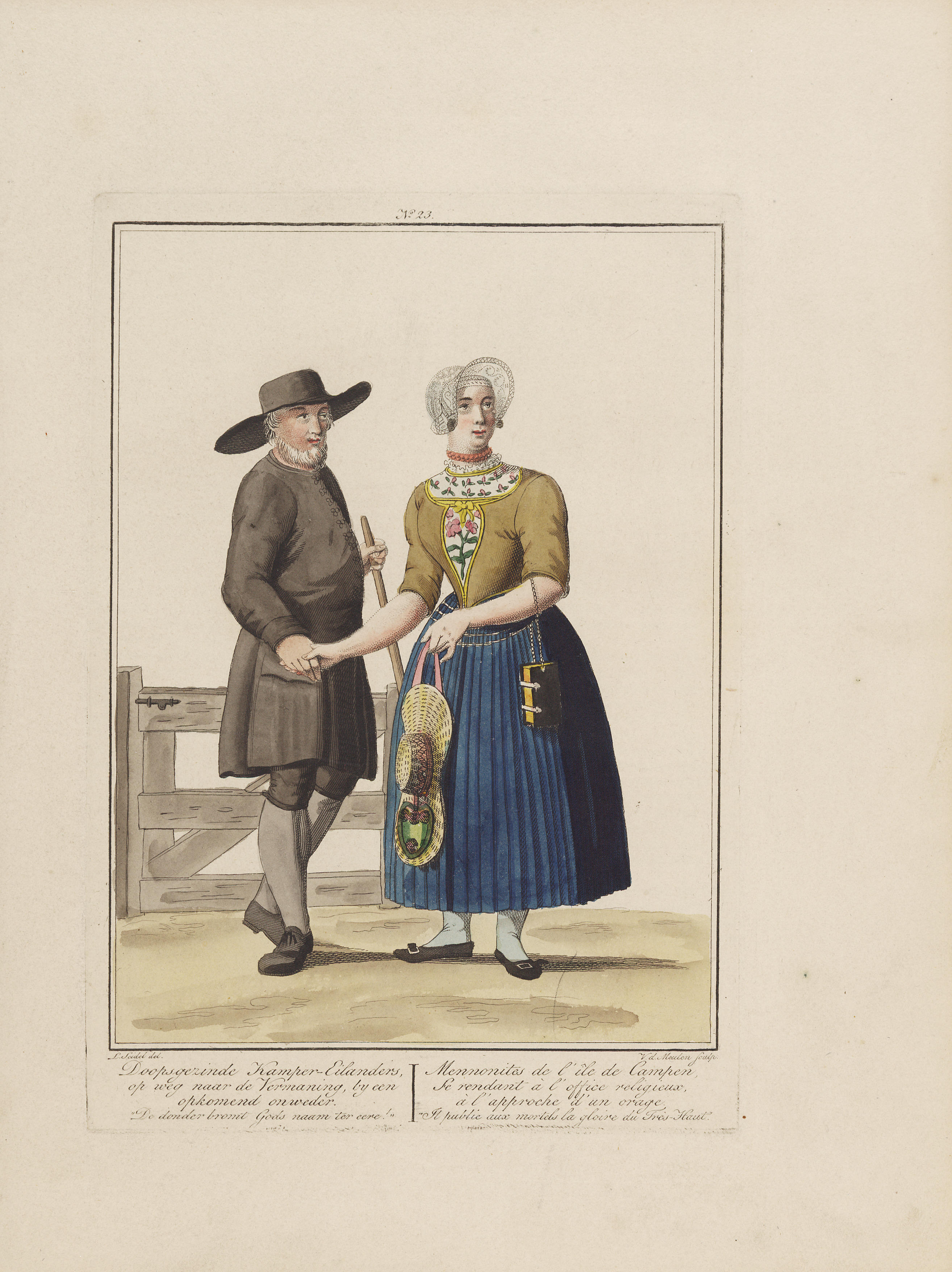 Doopsgezinde man en vrouw in streekdracht van het Ka...
