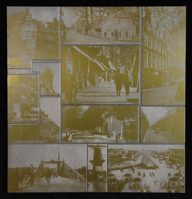 Metalen cliché van oud Rotterdam met twaalf stadsgez...